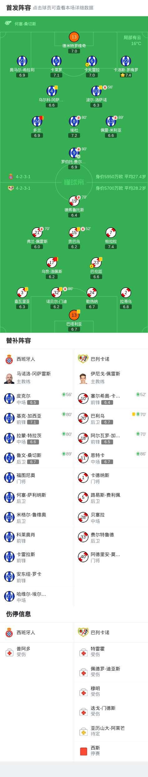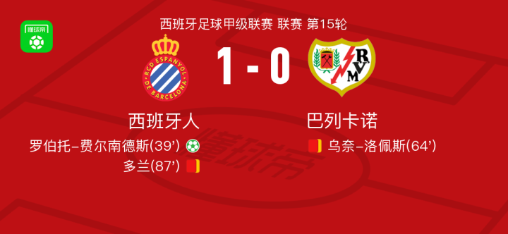 西班牙人1-0巴列卡諾,羅伯托-費爾南德斯點射制勝
